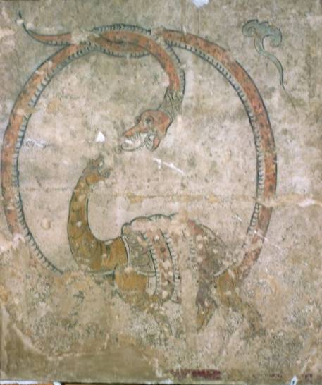 玄武是龟蛇合体的灵物为北方保护神,唐墓壁画多绘之以标志方位。