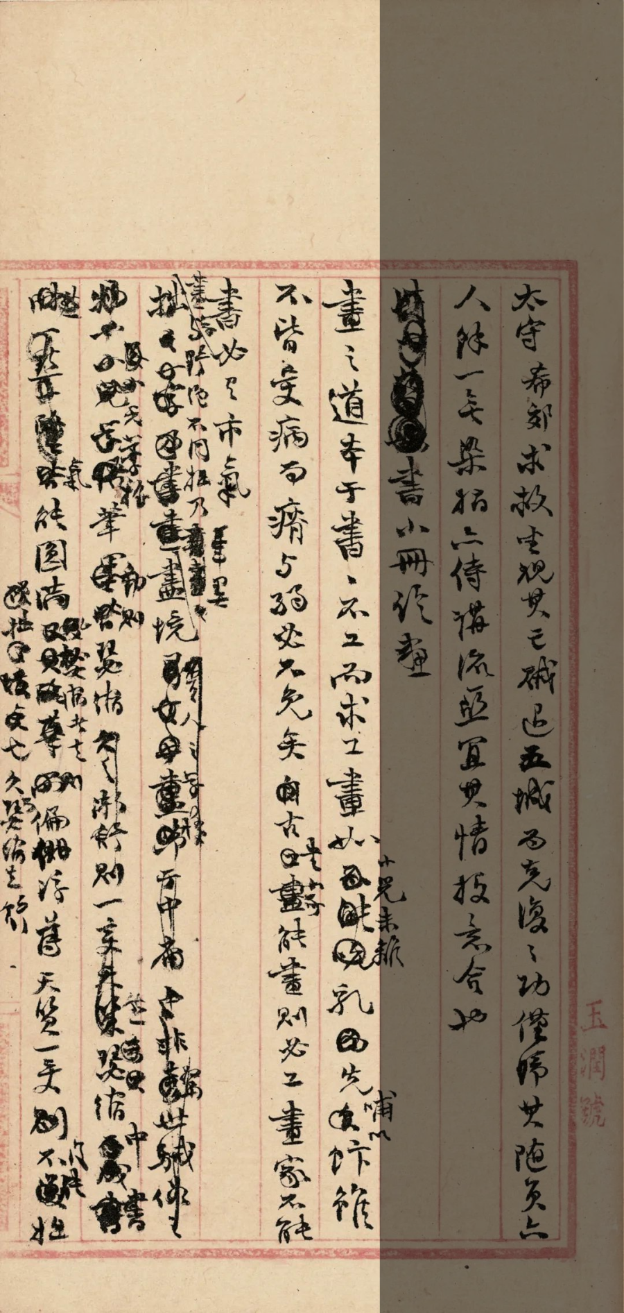 又:画之道本于书。书不工而求工画,如小儿未离乳先哺以饭,虽不皆受病,而瘠与弱必不免矣。古书家能画则必工,画家不能书,必有市气。