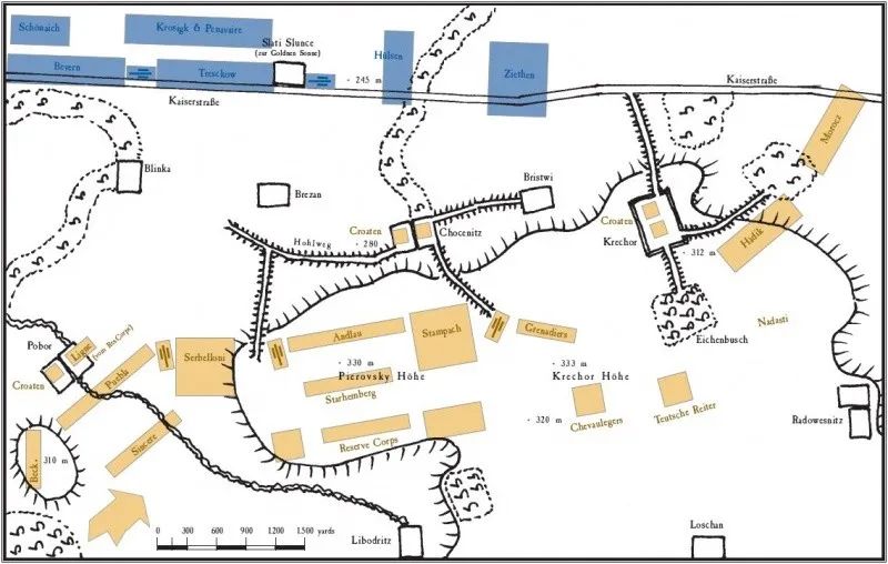 临近午时,腓特烈召集诸将并下达命令。国王认为奥军的左翼和中线难以撼动,位于克雷泽科尔高地的奥军右翼相对而言则比较薄弱。腓特烈计划沿着奥军的一线平行行军,直到抵达奥军右翼为止,为此齐腾和迪特里希.冯.赫尔森中将会在重炮的掩护下直面向右方的奥军,从而构成普军的左翼,掩护普军的大纵队进攻克雷泽科尔,由此普军摆开了一个“斜线队形”。然而,道恩借着普军早间到中午的时间也意识到自己左翼的一切危险都已消失。因此他把科罗莱多伯爵统帅的预备队,总计12个步兵营和27个骑兵中队转移到右翼高地的南坡。到了中午普军还没出发时,奥军预备队已经在右翼第二战列后方就位。