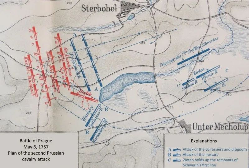 普军骑兵对奥军右翼的冲击态势在这段时间里,普军步兵对施特博霍尔以北的进攻也失败了。这14个步兵营在没有炮兵支援的情况下顶着奥军炮弹在泥泞中推进,“这一地区是由干涸的鱼塘形成的河床,上面长着的燕麦苗,当池塘重新积水时,这里就会成为附近被引流而来的鲤鱼的天堂。地面形成了柔软的黑色淤泥,人走在上边会陷进去,在最糟的一片地区,人甚至会陷入齐腰的淤泥中。”