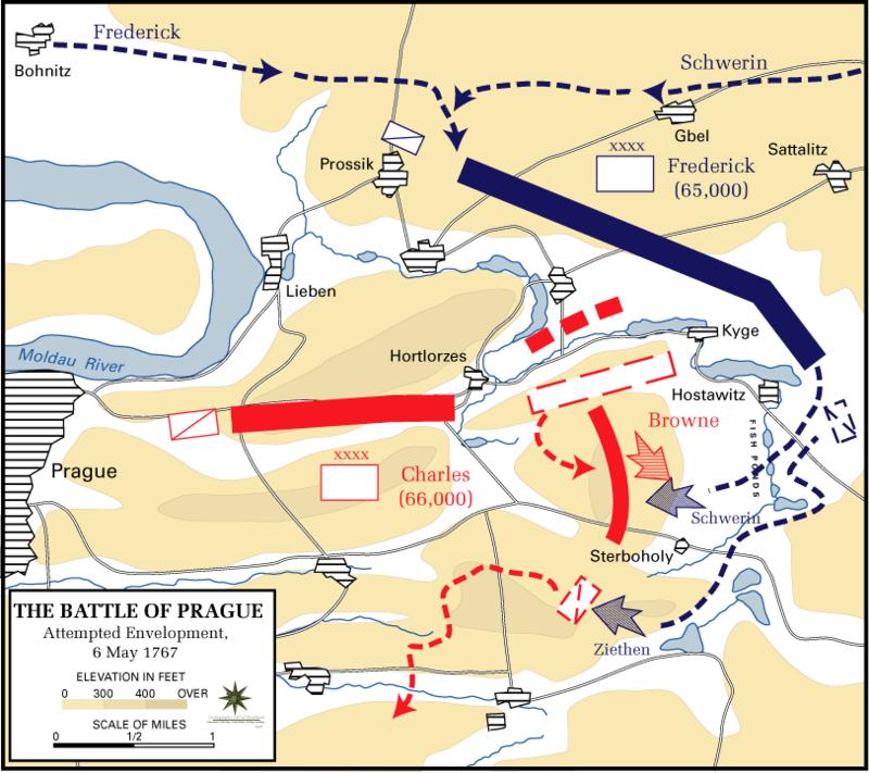 奥地利元帅洛林的卡尔亲王不过腓特烈并不是知难而退之人。他命令全军在5月6日发起迅猛的进攻,同时留下爱德华.詹姆士.基斯元帅统率32000人在莫尔道河左岸,以备在必要时切断奥军退往布拉格的道路。腓特烈,什未林和温特菲尔德在正对齐斯卡堡的普罗塞克山的最高点停留了一段时间认为正面进攻齐斯卡堡一线几乎没有成功的希望,因此,什未林和温特菲尔德又骑马跑到奥军阵地探查了一番,二人确信安特波彻尼茨-霍斯塔维茨-斯特博霍尔平原,也就是奥军的右翼,是普鲁士人通往胜利的唯一一条捷径。这一带虽然地形崎岖,还分布着因奥军打开水闸后灌溉而成的鱼塘,但相较其他地方已经是算平坦的了。而72岁的什未林元帅将为国王不惜一切代价夺取这条捷径,不惜一切代价。