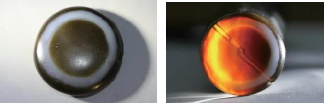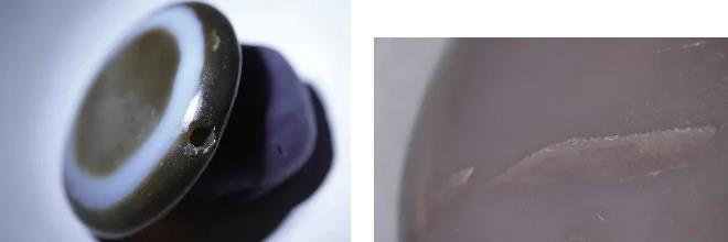 第二步:用40倍放大镜观察。初步观察赋存于珠体上的沁像及临近孔口的孔道特征;然后用手电筒的光从一端孔口射入天珠的孔道,并使光线从另一端孔口射出,借助光线的衍射状态观察整条孔道内壁的形态特征。
