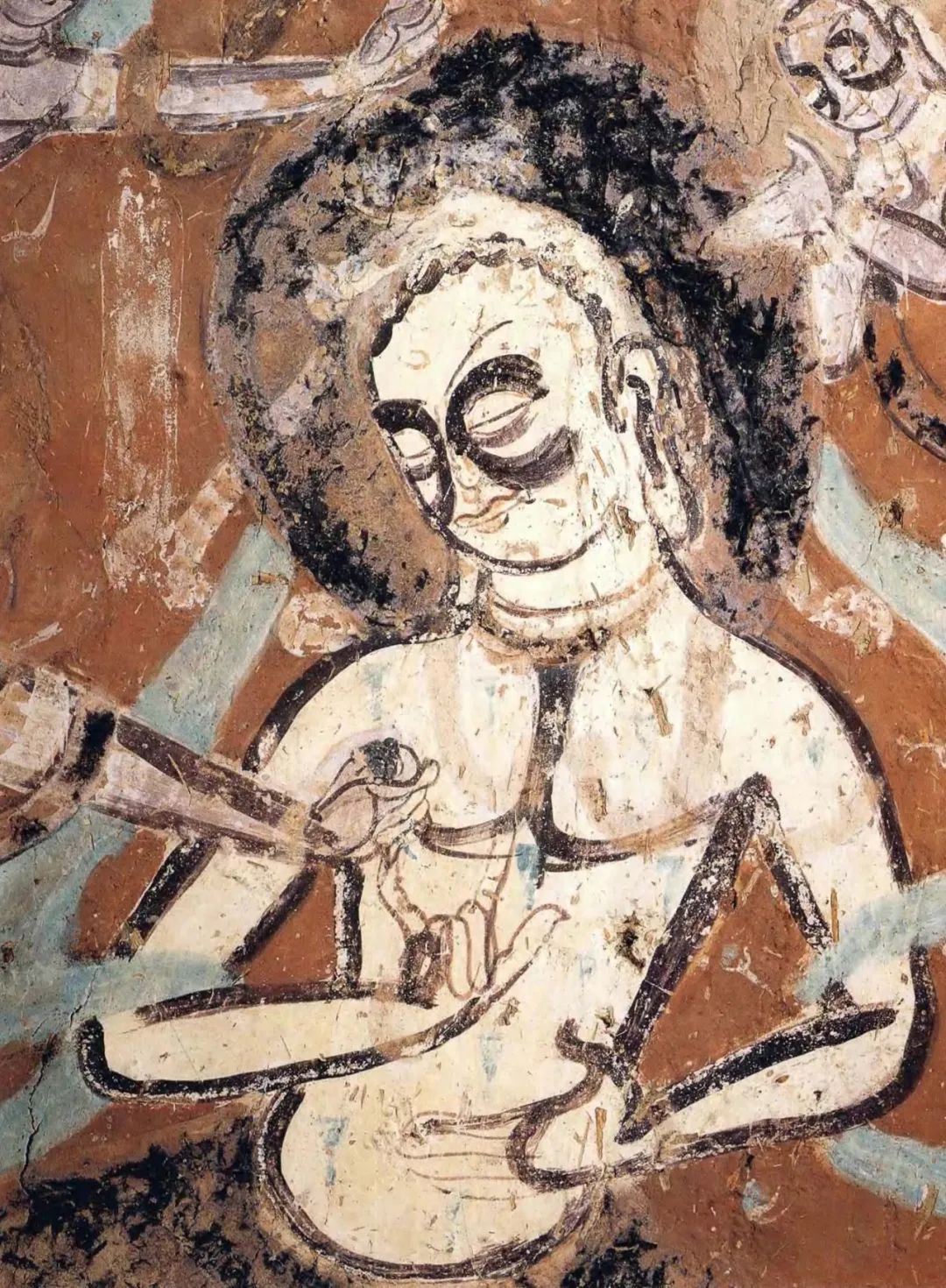 昨天我看到一张西魏的乐伎形象,被其细腻的造型和生动的视觉效果所感染。今天我又随即看到了书中介绍在莫高窟第263窟(北魏)揭开后来的壁画层而显现未褪色时的晕染法壁画效果。