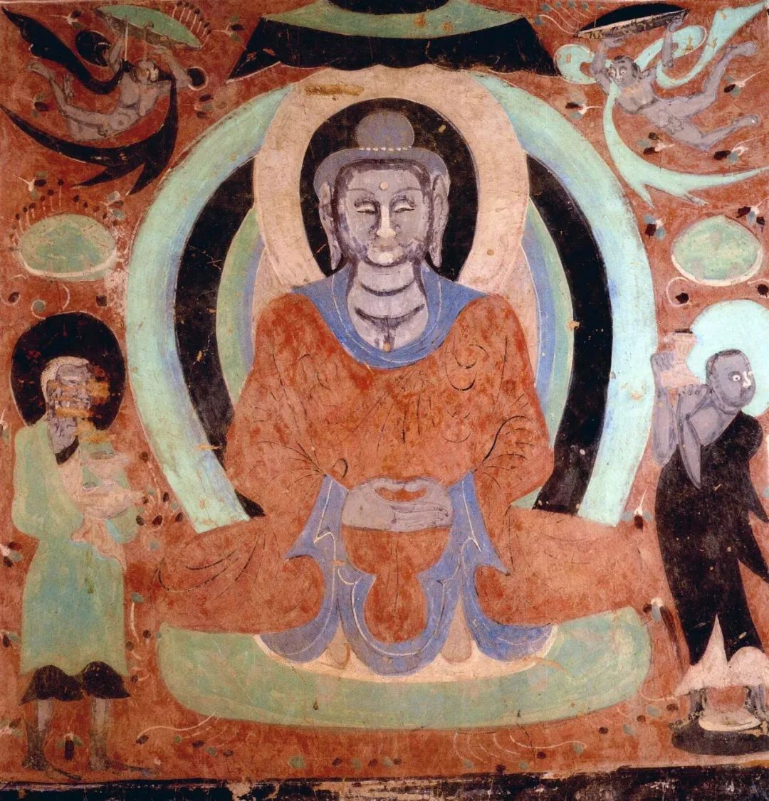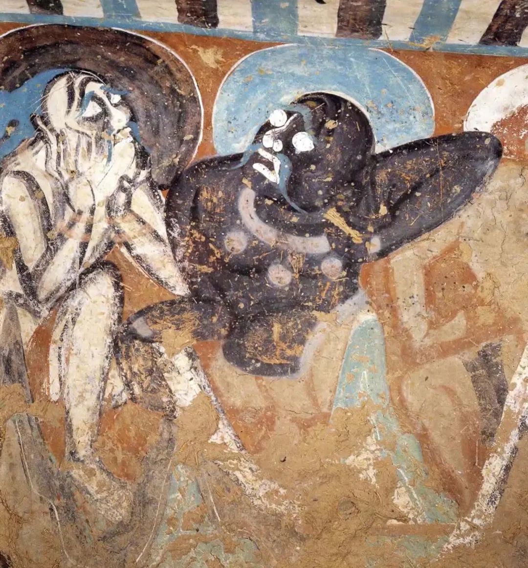 从北凉开始的敦煌壁画便一直强调“西域晕染法”,说这样的细致凹凸效果极具立体感。记得我第一眼看上去便觉得是粗粗的黑线条、以及诡异的面部轮廓。接着所有的材料都不断的强调这是因为年代久远而褪色后的效果。敦煌272窟壁画
