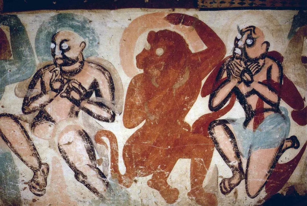 到北魏时人体晕染技法有新的进步。晕染色粗笔不再是简单地把形状各异大小不同的圆形组构人体,而是顺着人体骨骼肌理落笔去画,如面部额头、腮、颊、下颌、眼眶上下都是各自分开,依肌理结构画出粗壮的深色“线”,仔细晕染开,其他部位也是这样仔细晕染,使之达到肤色柔和,肌体丰满并有立体感效果。敦煌435窟壁画 药叉