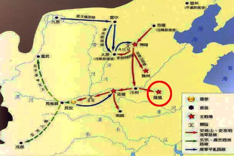 早在称帝之时,安禄山便派出两路大军,西攻潼关,东取睢[suī]阳。潼关一路直取大唐中枢,而睢阳一路则把控漕运,窥伺江淮。