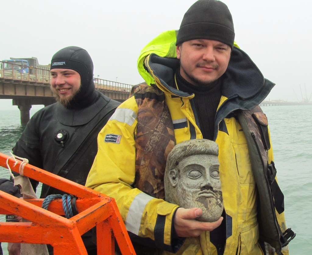 Но самый интересный предмет – терракотовую голову мужчины в натуральную величину - водолазы нашли лишь несколько дней назад. Голова выполнена из пористой глины методом оттиска с матрицы, по сырой глине гравировкой изображены волосы и борода, затем изделие прошло обжиг.