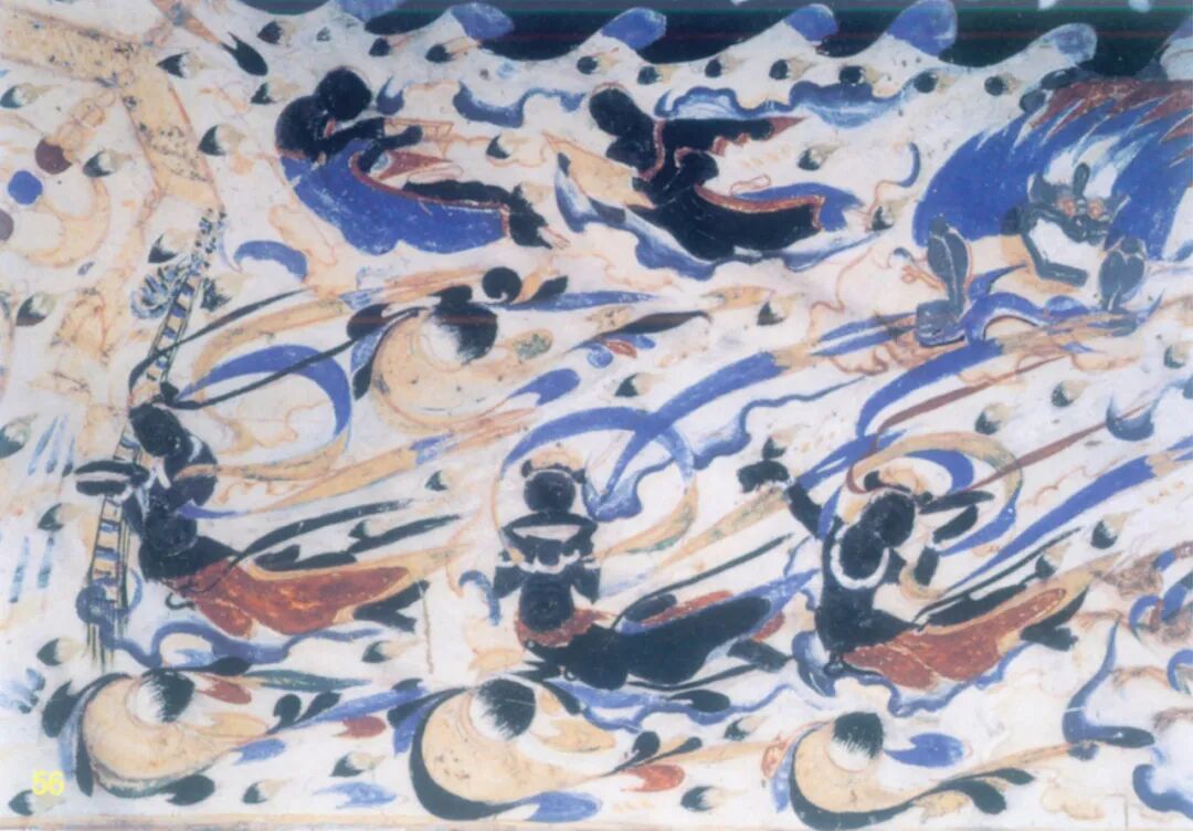再如第404窟四壁上部对天宫栏墙上的飞天形象的表现,背景的色彩以蓝色为主调,由浓到淡,上部颜色深下部颜色浅,表现出类似天空光线变化的效果。第427、420、419等窟中表现天宫栏墙上的飞天形象也运用到了这样的手法,只是因为变色,大部分底色都已变成深褐色;但从变化之后的壁面上仍可看出画家对底色色彩过渡的处理。