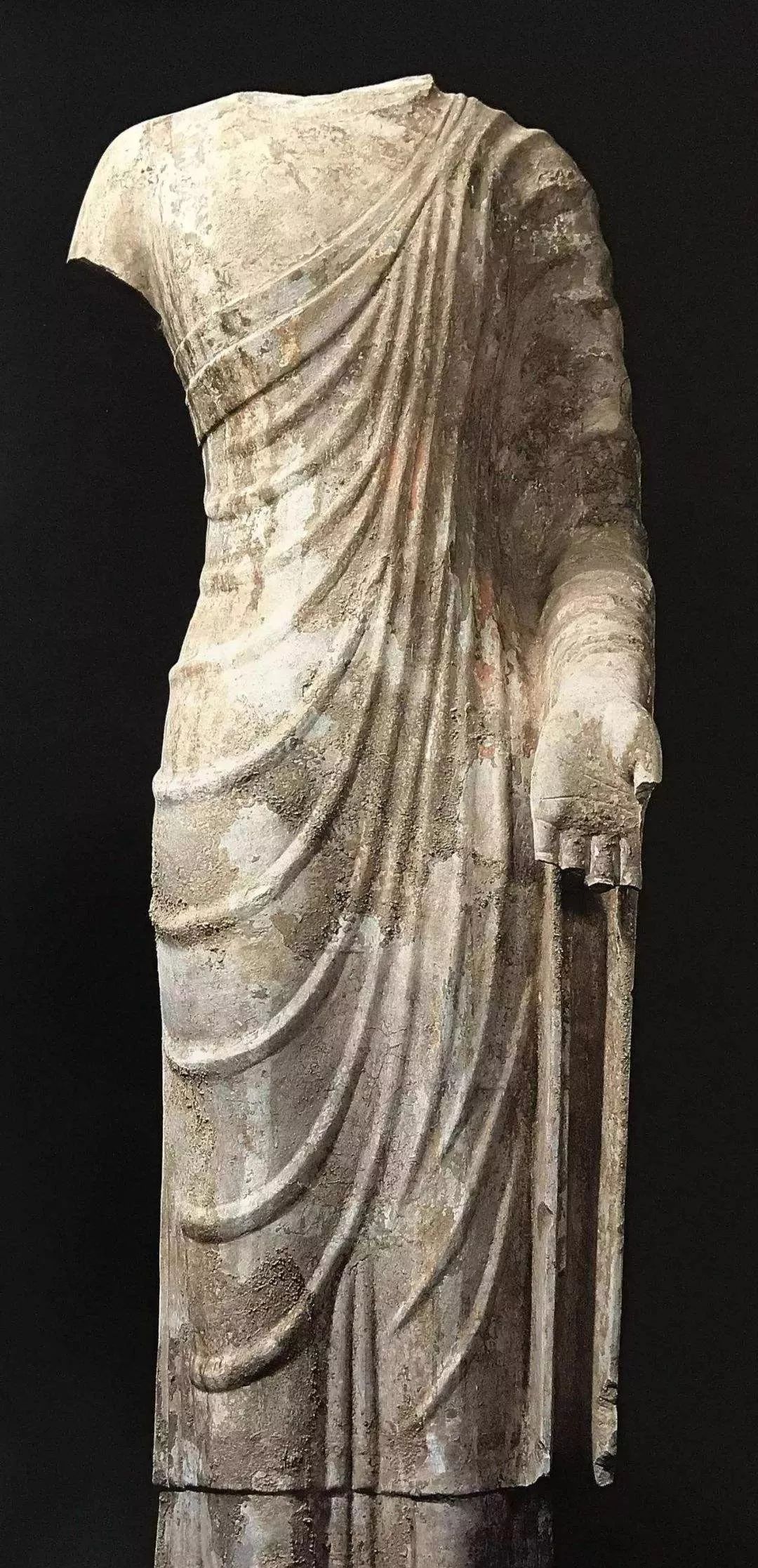 直接受到希腊罗马刻画丝绸女性、神像雕塑影响而在中国美术史彪炳千秋的是曹仲达和吴道子。他们两人留下了“曹衣出水”“吴带当风”的中国绘画顶峰式样式和范式。曹仲达是南北朝时(公元420—589年)北齐人,是当时和后世极为推崇的中国美术大家。唐代张彦远着《历代名画记》中说:“僧惊云:‘曹师于袁(袁昂),冰寒于水,外国佛像,无竞于时。’”这是说曹仲达师承自南北朝南齐画家袁昂,但比老师更加优秀,尤其擅长描画传入中国的外国佛像,无人可比。宋代郭若虚《图画见闻志》卷一“论曹吴体法”,将曹仲达和唐代著名画家吴道子相提并论,使用“吴带当风,曹衣出水”来比喻形容二人的艺术风格和成就。《图画见闻志》说:“曹之笔,其体稠迭而衣服紧窄。故后辈称之曰:……曹衣出水……雕塑铸像,亦本曹吴。”就是说曹仲达的绘画特别擅长人体和紧身衣服的关系,后人誉之为“曹衣出水”,即他绘画的衣服像人穿着丝绸衣服刚从水里出来一样,既透明又贴身,具有肉感和流畅的线条曲线,以至于他的风格又叫曹家样,时人雕塑铸像都是学他和吴道子。“曹衣出水”,这是多么生动形象的描状,这不得不让我们联想到希腊罗马的穿透明丝绸的女神像。而郭若虚说曹仲达“尤得绮罗之妙”,就是说他也特别会表现丝绸的韵味和精妙,是从丝绸衣饰的穿着效果获得了绘画雕塑的衣饰塑造的艺术灵感和艺术技巧。这可算得上是东西方的异曲同工、殊途同归、不约而同了。曹仲达的作品没有留传下来,但是他的“曹衣出水”的曹家样式的作品在敦煌壁画、佛像泥塑、石雕中都到处可见其踪影。1996年发现的山东青州佛像窖藏,出土了400余尊南北朝时期的石雕和各种材质的佛像,大部分作品都精美绝伦,具有极高的艺术水准,代表了中国佛教造像和雕塑艺术的一个高峰。其中有号称“东方的维纳斯”的最美女神像,也有被专家认定为堪称“曹衣出水”典范的穿丝绸袈裟的佛像。此外,山西天龙山石窟的雕像也有此风。天龙山石窟在山西太原市西南40公里天龙山腰。天龙山历史上曾是北齐(公元550年—577年)皇帝高洋之父高欢的避暑宫。四周山峦起伏,遍山松柏葱郁,山头龙王石洞泉水荡漾,山前溪涧清流潺潺。北齐时山下兴建天龙寺。石窟分布在天龙山东西两峰的悬崖腰部,有东魏、北齐、隋、唐开凿的24个洞窟,东峰8窟,西峰13窟,山北3窟。共存石窟造像1500余尊,浮雕、藻井、画像1144幅。各窟的开凿年代不一,以唐代最多,达15窟。唐代石雕体态生动,姿势优美,刀法洗炼,特别是其中的衣纹极其流畅,具有丰富的质感。第九窟观音立像,高约11米,形体丰满,璎珞富丽,纱罗透体,薄软的丝绸罗纱质感清晰,极巧妙地表现出肉体、纱衣、饰物三者之间的关系,显示出雕刻技法穿插迂回的功力,是天龙山石窟中艺术价值最高的一尊雕像。“曹衣出水”佛像雕塑与希腊罗马雕塑之间的相通性、关联性、继承性是显而易见的。史载曹仲达本人是来自西域的曹国人,是粟特人的一支。粟特人,在中国史籍习称昭武九姓,其原本居处的主要范围在今乌兹别克斯坦泽拉夫珊河流域的索格底亚那(Sogdiana)。包括有若干城邦小国,如康国(飒秣建,今撒马尔罕Samarkand)、安国(捕喝,今布哈拉Bukhārā)、曹国(劫布呾那Kapūtānā)、石国(赭时Chach)、米国(弭秣贺Māymurgh)、何国(屈霜你迦Ku?ā?ika)、火寻(花剌子模Khwārizmik)、史国(羯霜那Kashāna)等等。其中以康国为最大的宗主国。粟特人姓氏以安、康为主体,包括曹、安、史、康、石、罗、白、米、何等。这给我们研究中意丝绸雕塑之间的关系更是留下了丰富的想象空间。还不止于此。中国绘画家们将衣饰表现艺术又推到另一极致。于是又有“吴带当风”的出现。吴,就是吴道子(约公元680年—759年),是盛唐时代最负盛名的画家,后人尊为“画圣”。所谓“吴带当风”,就是他所绘人物衣带宛若迎风飘曳之状,即“天衣飞扬,满壁风动”。吴道子长于壁画佛像创作,在描画人物衣饰上开一代先河,创其动态表现新风。他把线条用到极致,将衣纹绘出高、侧、深、斜、卷、折、飘、举各种姿势,人称“风云将逼人,鬼神若脱壁”,可见其造像栩栩如生,充满动态美、韵律美。代表作有传世的《送子天王图》《八十七神仙卷》等,据载他曾于长安、洛阳两地寺观中绘制壁画300余堵。唐张彦远《历代名画记》曰:“唯观吴道玄之迹,可谓六法俱全,万象必尽,神人假手,穷极造化也。所以气韵雄壮,几不容于缣素;笔迹磊落,遂恣意于墙壁;其细画又甚稠密,此神异也。”宋代郭若虚《图画见闻志》说:“吴之笔,其势圆转而衣服飘举。”这就是“吴带当风”。曹、吴二人所创“曹衣出水”“吴带当风”,一静一动的表现丝绸衣饰,静到肃然起敬,动到运斤成风,把一种衣饰绘出两种姿态和线条,成为艺术史上开宗立派的一代大家。东方和西方各自相关、各行其是,各美其美、美美与共。
