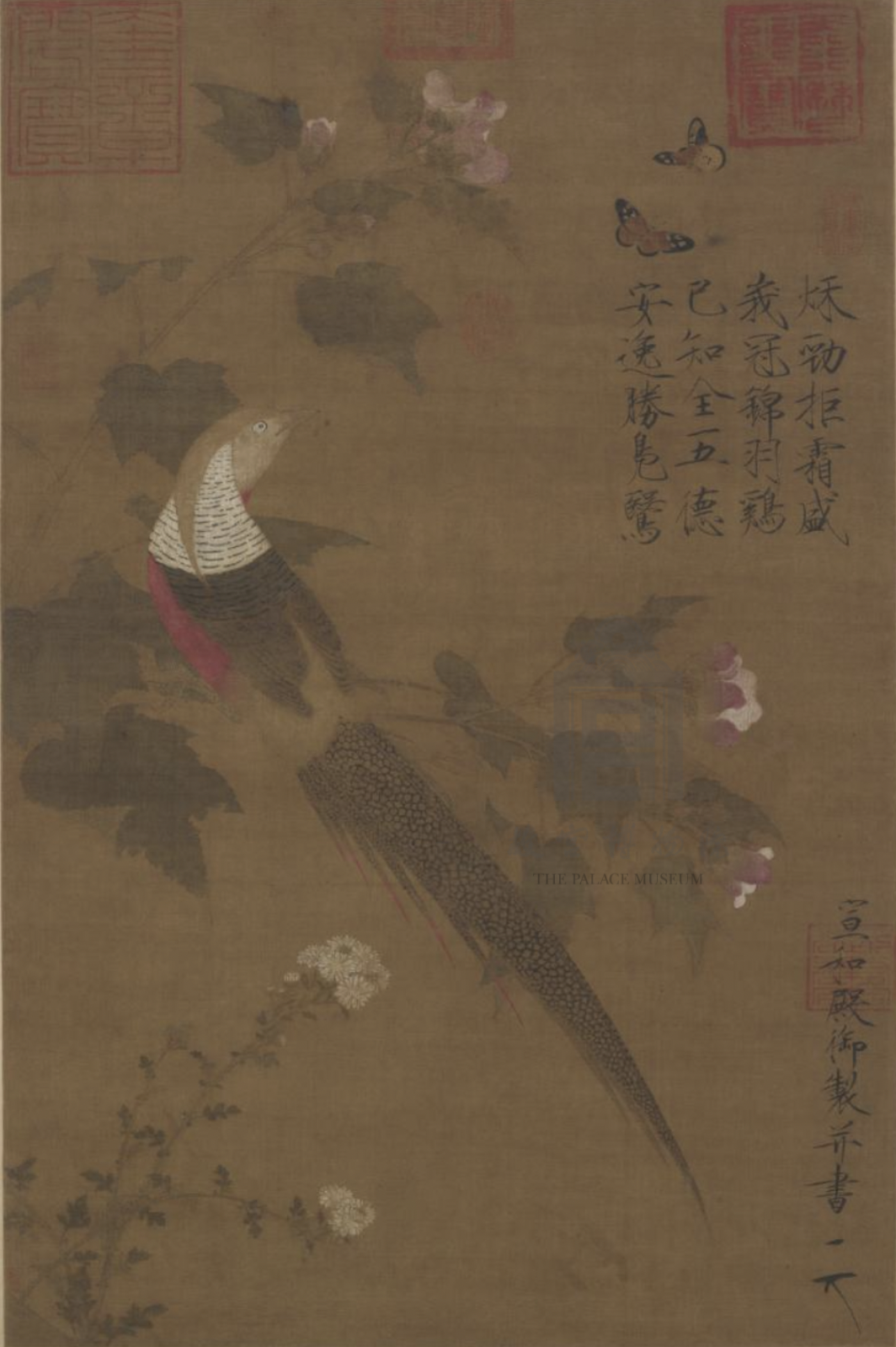 作为独立的画科,宋代的花鸟画无论在绘制技巧还是表现形式方面都已经达到高度的艺术水准,《芙蓉锦鸡图》便是其中的一幅精品。此图是描绘金秋景色的花鸟画作。图中芙蓉盛开,随风轻轻颤动,蝴蝶翩跹,相互追逐嬉戏,引得落在枝上的锦鸡回首凝视,目不转睛。本幅右上宋徽宗赵佶以瘦金体题“秋劲拒霜盛,峨冠锦羽鸡。已知全五德,安逸胜凫鹥”,右下书款“宣和殿御制并书”,草押书“天下一人”。鸡在中国向有“德禽”之称,《韩诗外传》载:“鸡有五德:头戴冠者,文也;足搏距者,武也;敌在前,敢斗者,勇也;见食相呼者,仁也;守夜不失者,信也”,可见其文武兼备、仁勇具存、信守专一的性格为世人所激赏,难怪才艺绝代的一代帝王也会留下“已知全五德,安逸胜凫鹥”的诗句,流露出对安逸高贵之品格的赞许,由此体现了中国花鸟画的人文寓意。