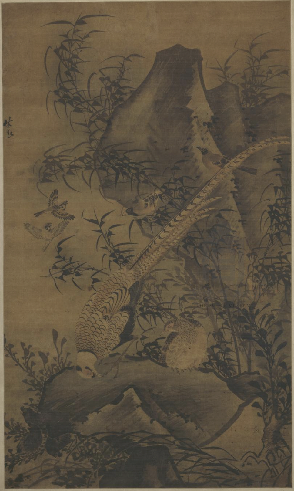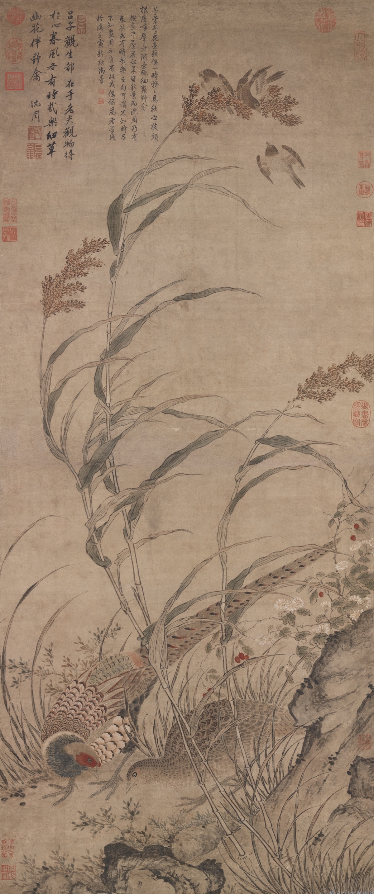 高梁丛底下,一对野雉正在低头觅食,另外还有三只荜雀翱翔于上,构景既真实生动,又富趣味性。画上并没有作者的签名,因为钤盖了吕纪的印章,而被误认为是他的作品。实际上这幅画虽然极好,但风格却和吕纪不尽相同,推测应该出自明代其他高手所作。吕纪(活动于1439—1505年间),浙江鄞县人。明孝宗时任职于仁智殿作画,并被授予锦衣指挥的官名。