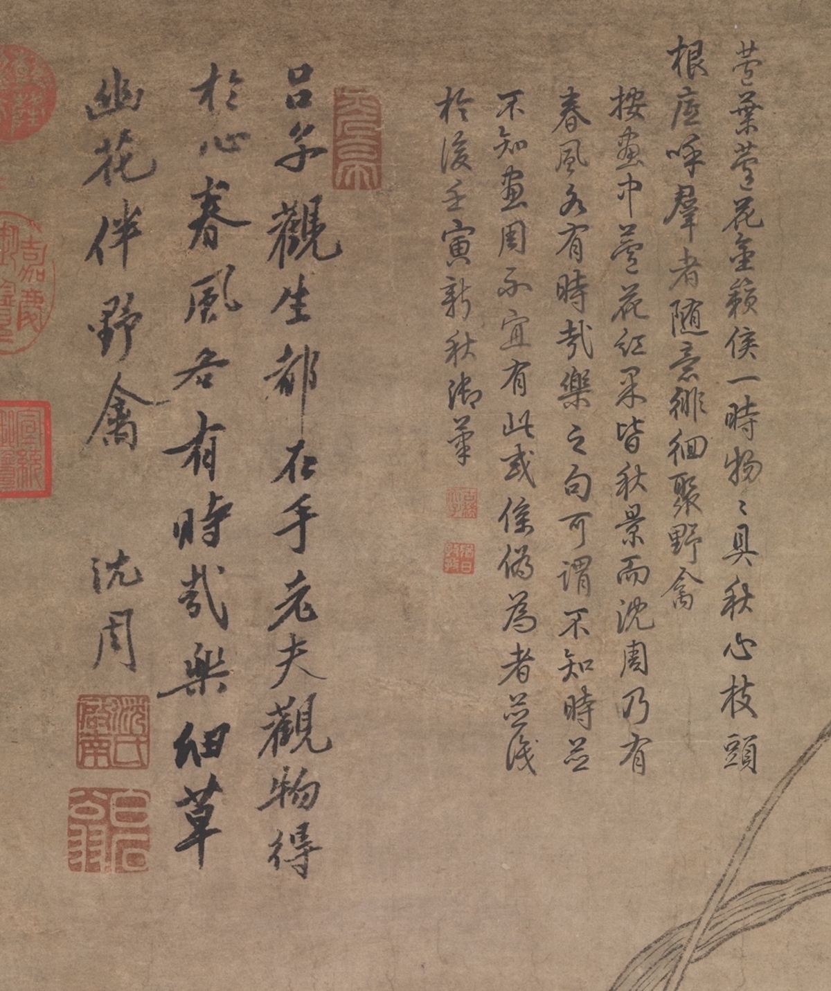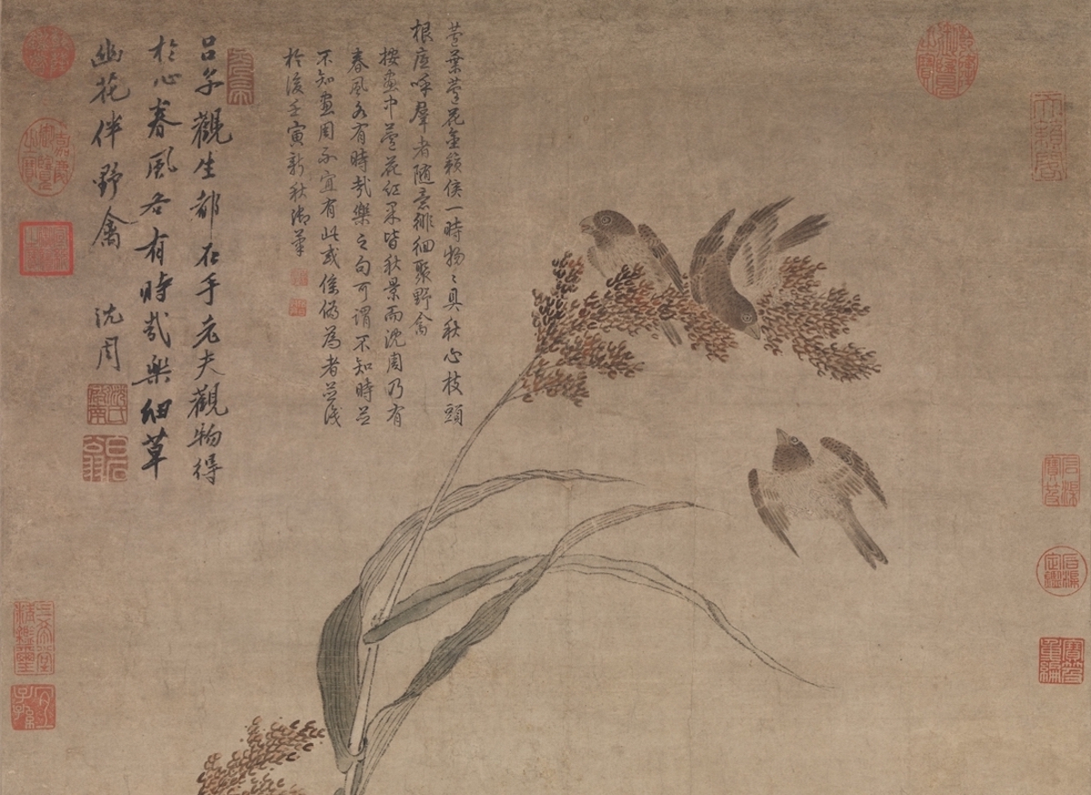 本幅有沈周行书题跋:吕子观生都在手,老夫观物得于心。春风各有时哉乐,细草幽花伴野禽。沈周。