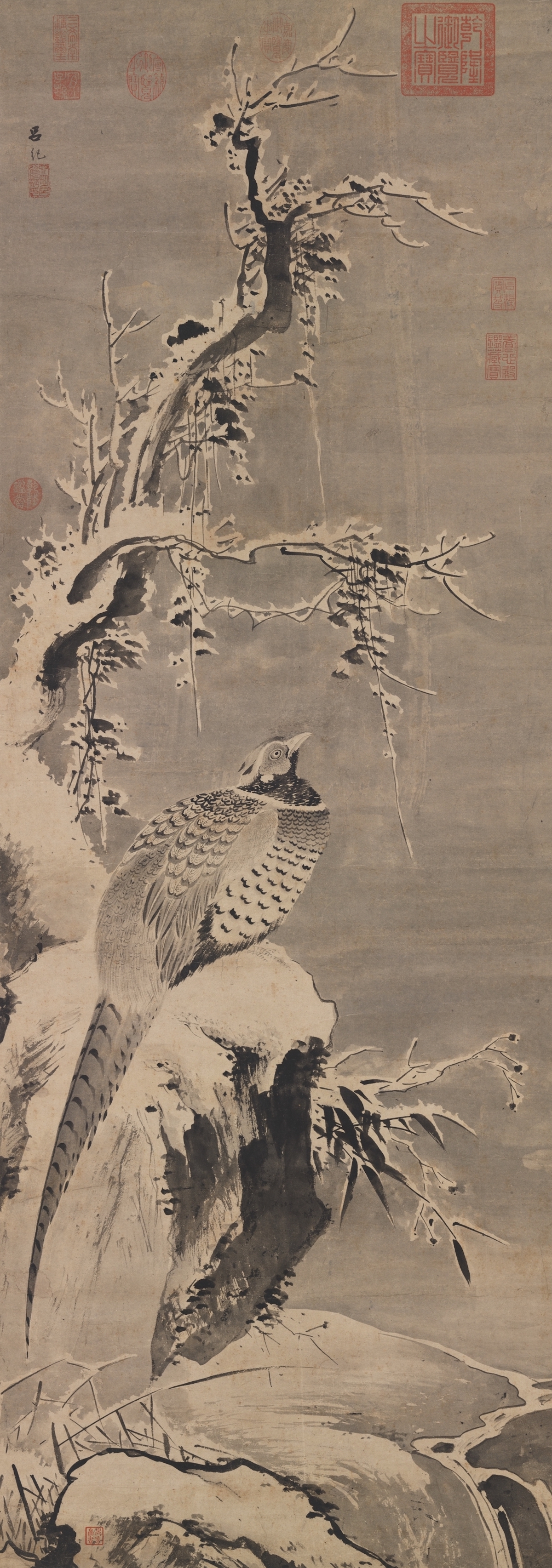 此图绘天寒地冻之时,山鸡独踞岩上,昂首翘望,似有所待。作者为描写这份冰雪茫茫的气氛,用淡墨把天地都染黑,而让树上、岩上露白,以表积雪,并与右下角那道白亮蜿蜒的流水,互相迸发出凛冽的寒气。再加上萧条的藤萝和神情索漠的山鸡,令人觉得天地之间一片孤寒,是难得的佳作之一。