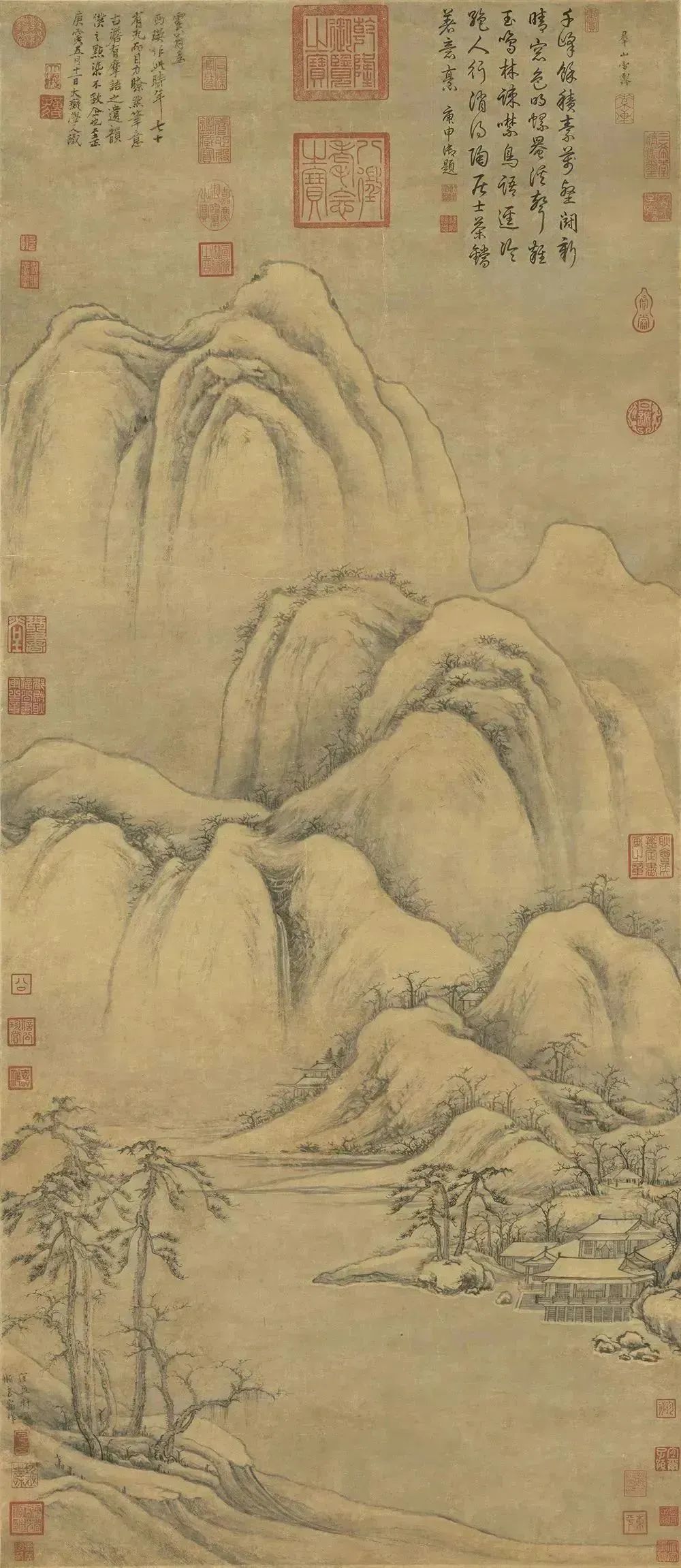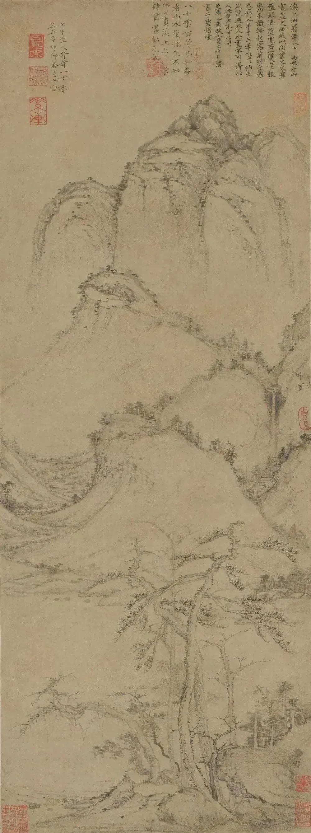 故宫博物院藏,作于至正十一年(1351),为曹知白现存最晚的画作。画面为元画常见的“一河两岸”式江南景致,山峰高远,层层叠叠,山谷茅屋掩映于丛林之中,近处松树挺拔苍劲,之间水面若镜。采用披麻皴绘山石起伏,层次分明,虚实有度,墨色简淡,温文尔雅,体现出元代文人画的审美趋向与笔墨情趣。