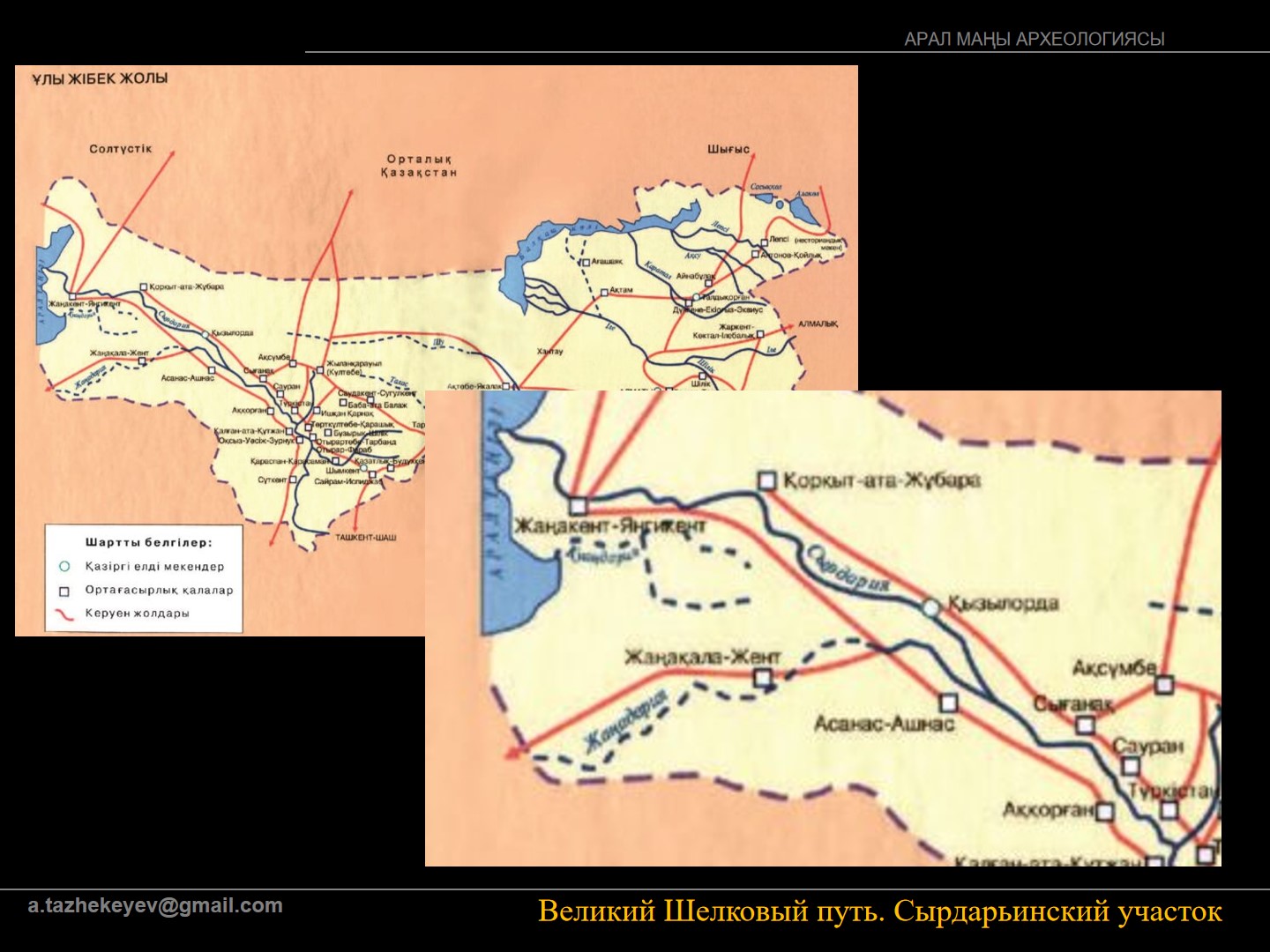 Все они располагались вдоль одного из отрезков Великого шелкового пути – Сырдарьинского, который по археологическим материалам показывает, что начал интенсивно функционировать не раннее VII-VIII вв. н.э., когда данная территория вошла в состав тюркских государств, в особенности огузо-кипчакского и кипчако-хорезмского периода. Если некоторые упоминаются в источниках IX-X вв., такие, как крупные городские центры – Джанкент (Янгикент), Джент, Сыганак, Хора, то другие упоминаются только в золотоордынское время – Асанас, Барчикент, Ак-корган и др. Археологические работы показывают, что в большинстве своем города на Сырдарьинском отрезке Великого шелкового пути сформировались на основе отраро-каратауской и джетыасарской культур, население которых которые впоследствии геополитических изменений в бурном средневековье меняли свой статус и погибали в междоусобных войнах.