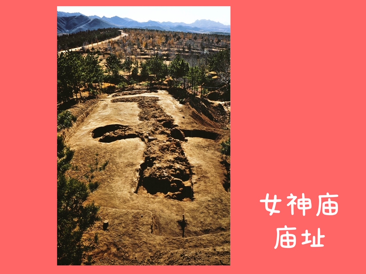 牛河梁遗址第一地点的1号建筑址就是女神庙。揭开表土之后能看到在女神庙里有栩栩如生的女神头像、泥塑熊的下颌还有泥塑的熊爪、鹰爪;还出土绘有几何图案的彩绘壁画残块,由此可知女神庙被装修得非常精美。