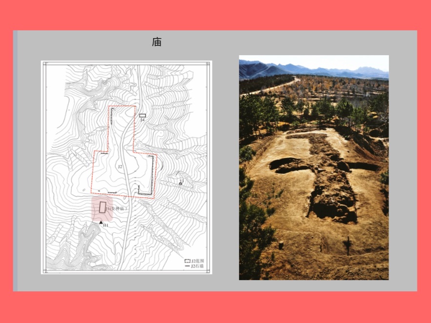 世俗权力方面的成就则显示在沿山体梯级而上修筑的超过6万平米的台基建筑群,这些建筑是一次规划并在短时间内营建完成的,利用了自然山体并实现了对自然山体的改造。女神庙与北侧的两座台基址以及通道、八字形排水沟和挡水墙形成了中轴对称布局的建筑群,开创了中轴对称模式的先河。土石交错铺垫台基的做法,与《营造法式》技术标准近似,是后期建筑标准的源头。以上这些发现凸显了红山社会强大的组织管理能力,充分说明红山社会的发展阶段已经达到了相当高的程度。