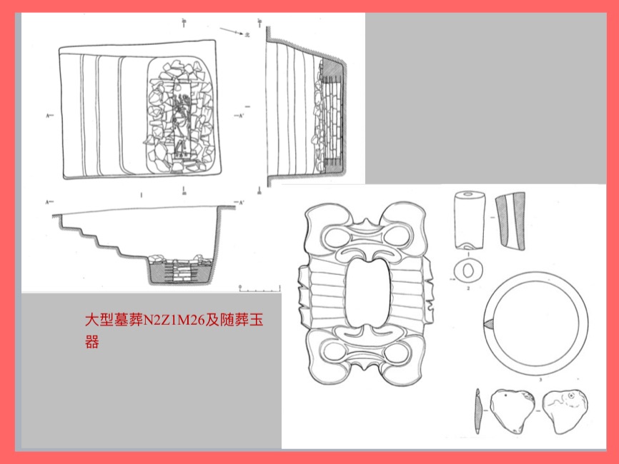 1号冢内北边是大型墓葬,往南一点是中型墓葬,最南边是小型墓葬。从中心大墓M26墓葬平面上可以看到一侧是阶梯的墓道。商周时大墓都有墓道,一侧带阶梯状的墓道开了中国墓葬制度的先河,但我们在距今5000多年的牛河梁就已看到滥觞。墓中随葬的玉器非常精美。中型墓葬规模小一些,有的南侧有两级阶梯,但墓圹明显变窄,也随葬了玉器。小型墓仅能容身,墓坑很浅,几乎没有随葬品,个别有一两件玉器。