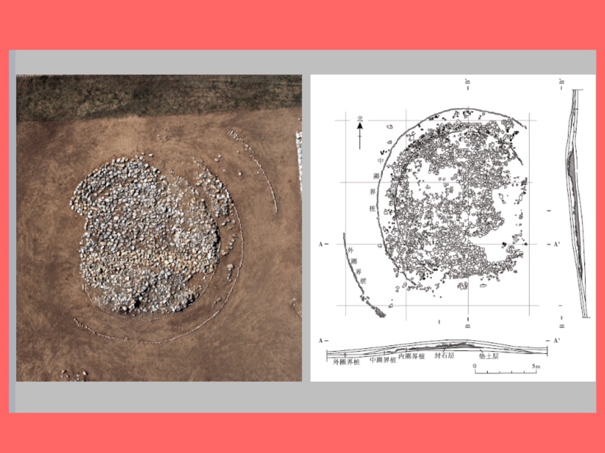 牛河梁遗址第三地点只有一座冢,外面一圈是墓葬,它的中心大墓位于中心偏北,而很多小型墓是有叠压关系的。
