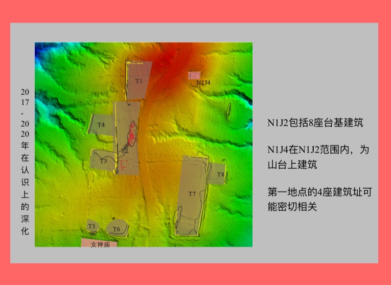 2017年-2020年,我们把原来含有北山台、西山台、东山台的品字形山台进行了重新划分,根据地面调查和试掘的发现将其进一步划分为8座台基址,根据台基址外围石墙的分布范围可以发现,8号山台石墙向北延伸的区域已达4号建筑址的外侧,由此可以确定4号建筑址应该就在山台区域内。这样,其他的2座建筑址,女神庙、陶片窝可能与山台也有密切的关系,第一地点的4座建筑址并不是各自独立的,而可能属于一个统一整体。