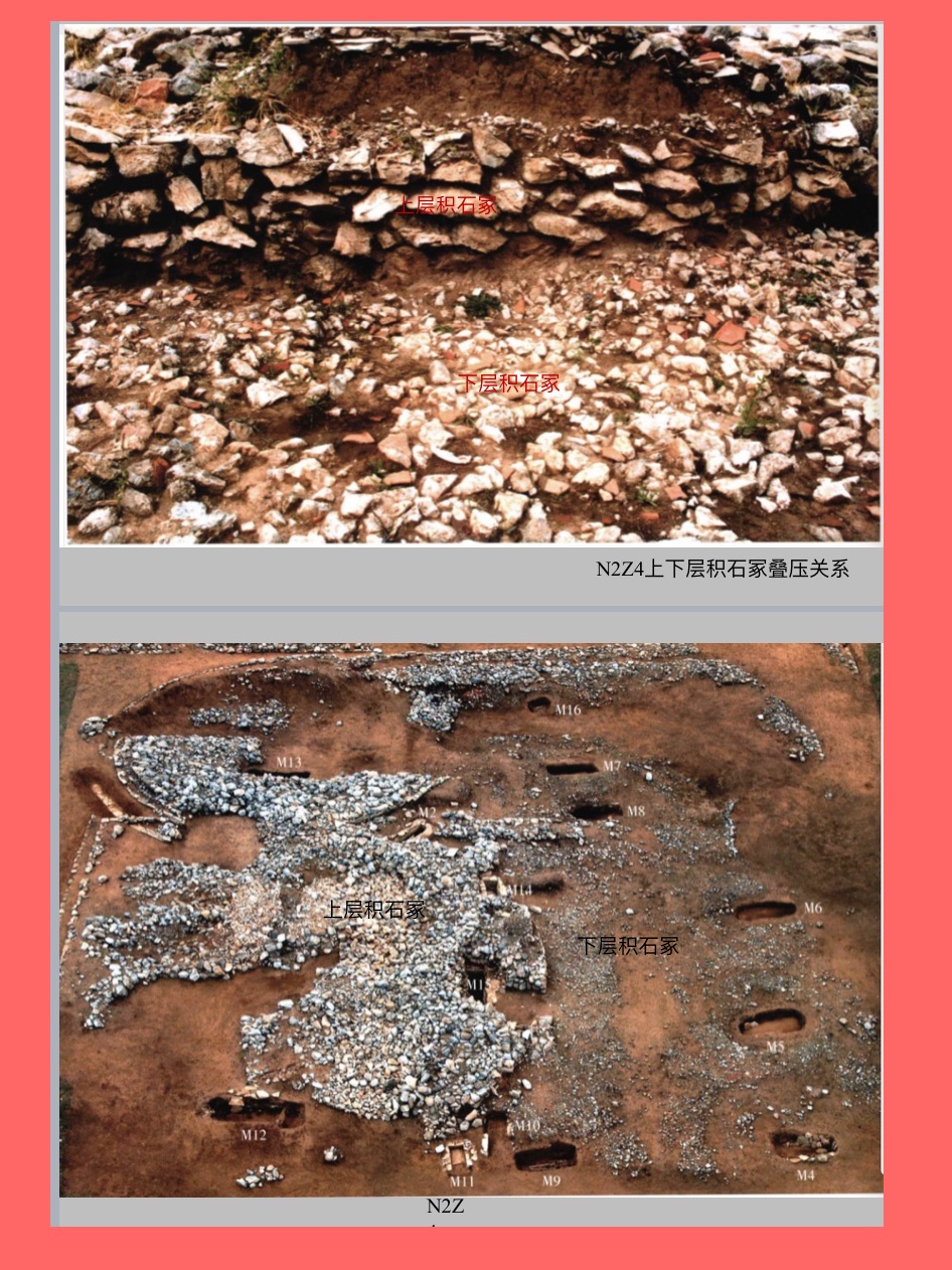 牛河梁遗址的积石冢可以分为上层积石冢和下层积石冢两个阶段。大墓基本都是上层积石冢阶段的,年代稍晚一些。上层积石冢阶段一般都有石块垒砌得较好的石棺。下层积石冢一般为土坑墓,周围以碎石封盖,随葬品中少见玉器,在2号地点4号冢M5出土有彩陶盖罐但不见玉器。而上层积石冢阶段,如第五地点1号冢M1则只随葬玉器。