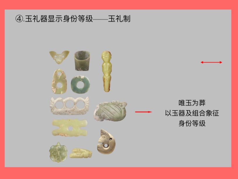 唯玉为葬,以玉器及其组合象征身份等级,在牛河梁里也表现得非常清楚。以器物的组合与种类作为确定地位等级的首要原则。比如在第二地点1号冢两座中心大墓、中型墓、小型墓各出土怎样的玉器,一看就能分辨出来。