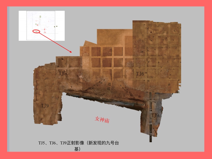 2021年开始,经过细致调查和发掘之后,找到了8座台基址的大致分布范围,调查在原来所认识的“2号建筑址”的外围还发现了多座零星石墙,推测也和台基建筑相关,至此,整个台基建筑群的范围已达近10万平米左右。同时在通向女神庙的位置我们发现了9号台基,从平面关系上来看,1号建筑址女神庙有可能就座落在9号台基上。9号台基上的两条探沟的发掘发现了由夯土、石头铺垫的基础。在5、6号台基之间的凹陷地带发现了一条从走向来看是通向女神庙的通道,通道两侧对称排列的两道用石头垒砌的挡水墙和向东西两侧延伸的很长的排水沟。