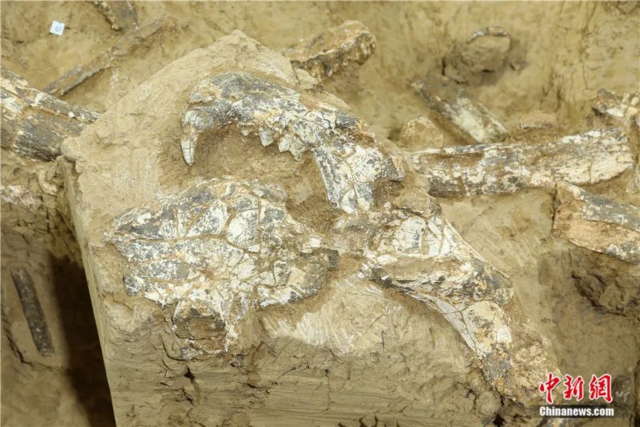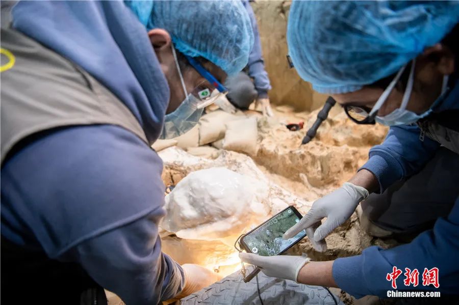 这枚头骨化石从2022年5月18日面世到同年12月3日被提取出土,历时半年多。为保护化石,后续修建了恒温恒湿考古方舱。提取出土的头骨被妥善存放在特制保险柜中。