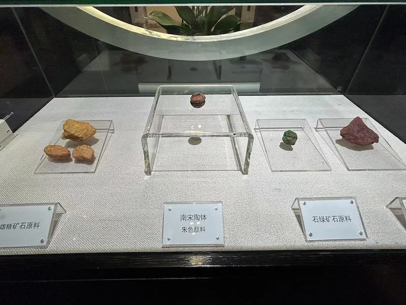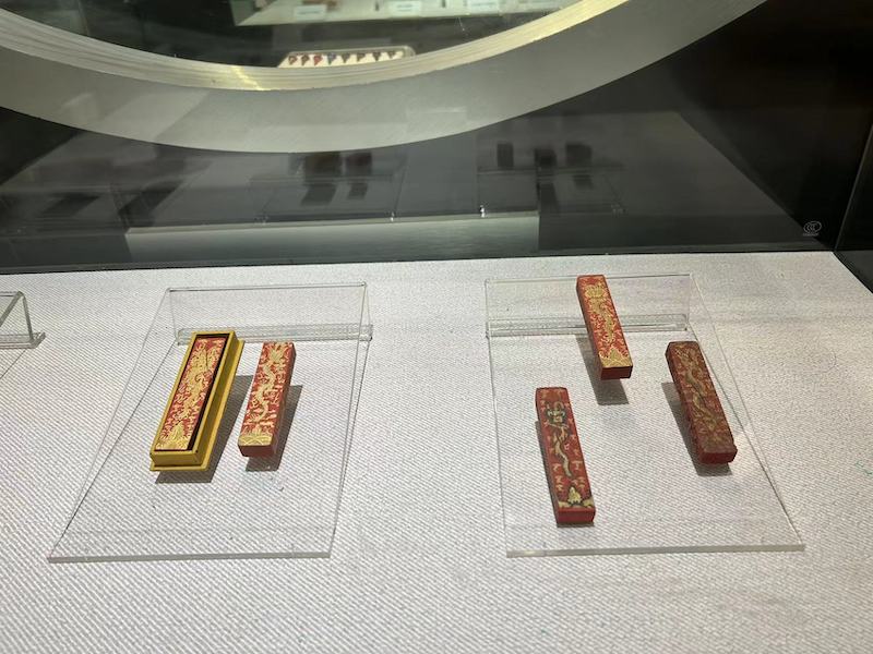 这次展出的展品,从原矿石料到精制墨品、乃至当代颜料逾百件;其年份,从南宋至当代,跨度几近千年,其中有考古出土的南宋窖藏朱砂,明朝晚期的“登龙一品”,清康朝“满文石蓝”,乾隆年间“五彩墨”,直至民国上海马利颜料,也有日本、英国等品牌商标的彩色墨。与传统黑墨一样,用墨模铸塑的彩色墨锭,也有显明的文字名款和优美的图饰,深蕴丰富的文化内涵和人文元素。如有康熙文华殿大学士张英(张廷玉之父)进呈朝廷的“贡朱”墨,嘉庆年间名臣铁保监制的“御制民生在勤”朱砂墨,同治年善甫氏定制的“六韬三略”彩色墨,晚清名士梁启超定制的“饮冰室用墨”“任公临池墨”彩色墨;有名坊曹素功的“万年红”朱砂贡墨、“凤池春”“祥云纹”彩色墨,胡开文的“凤皇云”朱墨,查森山的“文苑斋”“攀桂”“班琚”彩色墨,日本皇室御墨坊“古梅园”制作的朱磦墨,英国的飞狮图饰彩墨等等。还有用描金绘龙漆盒原装的,由十种颜色、按八卦图案组成的彩色套墨,可谓琳琅满目,精彩纷呈。展品中更有数锭小墨比婴儿小指还小,仅重3-4克;而一锭超大朱墨,重达14.5公斤,墨面镌刻“西子湖图”,图上绘有标注地名的名胜景点195处,令人观为叹止。