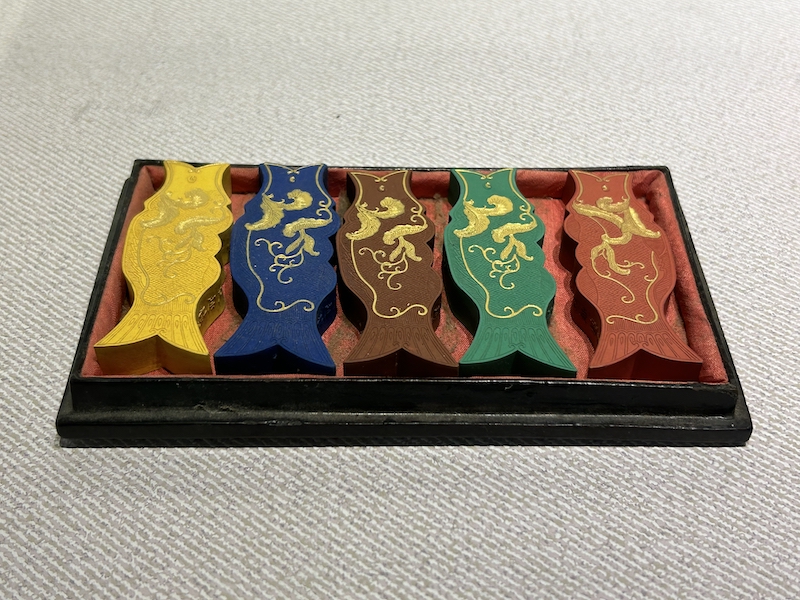 彩色墨的制作与一般制墨工艺相同,只是以彩色色素原料取代黑色墨灰,与黏合胶进行调和,同样经过拌合杵捣,揉搓成果,入模塑形,翻晾阴干,描金饰纹等各道工序,制成彩色墨锭。使用时同样研磨成汁后用毛笔蘸写挥洒。