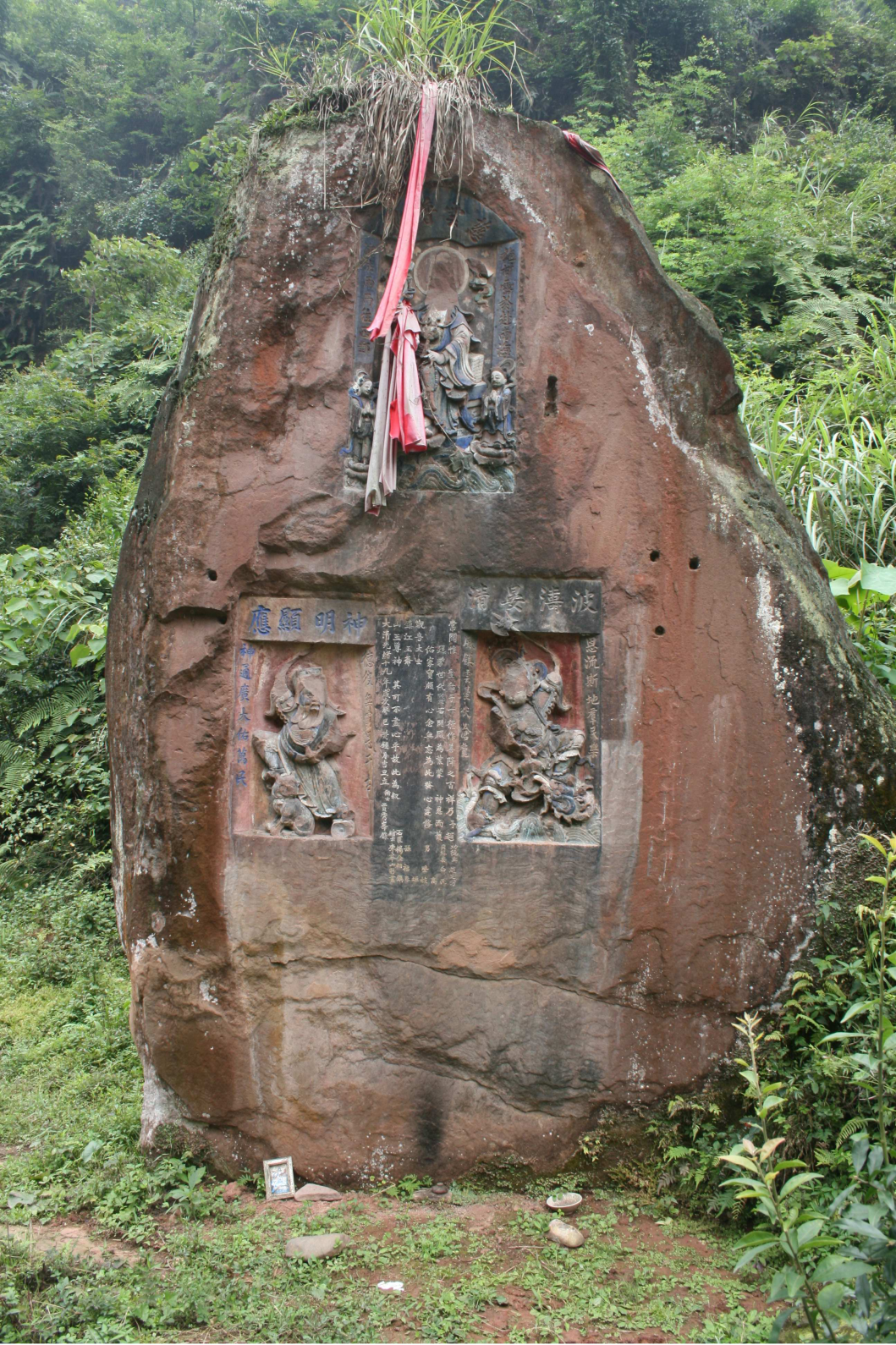 摘要: 立石子摩崖造像位于洪雅县中保镇踏水村龙王沱西300米,分布面积20平方米,为清光绪十九(1893)年赵庭芳所造,位于一高4.75米、底宽4米类三角形岩石上,离地面1.5米高,品字型排列造像3龛3尊。K1长方型敞口平顶拱形龛,高1.28米,阔0.7米,深0.13米,造净瓶观音,左右侍立童子;K2敞口平顶,高1米,阔0.62米,深0.1米,造山王神像,右手执鞭,足踏猛虎;K3 ...
