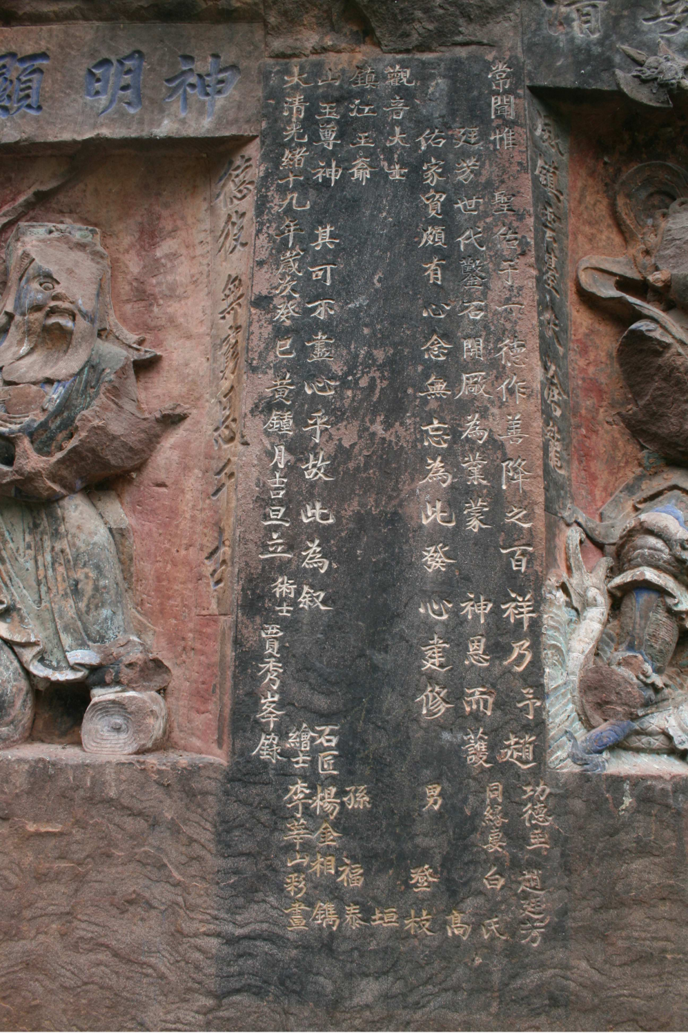 题刻内容:尝闻惟圣佑于一德,作善降之百祥。乃予赵廷芳世代凿石开厂为业,蒙神恩而获佑,家贸颇有,为此发心建修观音大士、镇江王爷、山王尊神,其可不尽心乎。故此为序。赵廷芳。