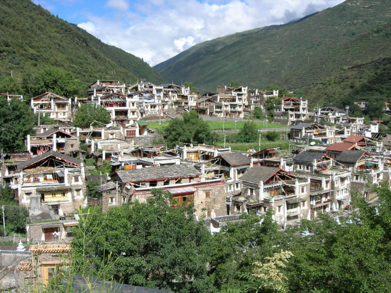 位于四川省阿坝州马尔康县卓克基镇西索村一组,是嘉绒藏族最典型的村寨,依山傍水,建筑群占地面积约25705平方米,完整的保持了“众皆依山居止、累石为室”的建筑特色和风格。西索民居分布在南北长约200米,东西宽约150米的范围内,建筑群落由民居、西索寺庙、村委会活动室等构成。整体依山势布局,村寨中心区域为空地,原为卓克土司出巡或重大事务时召集百姓,集结人员的场所,现为西索村村委员会活动场地,四周皆为民居建筑。有大小65座民居建筑,风格相同,均为传统石木结构,大者占地百多平方米,小者占地50平方米以上,占地平面呈四方形,四方墙体以片石垒砌黄泥沟,各墙面砌筑内直外收,墙体表面内收呈弧形,楼层三至四层不等,底层为畜圈,第二层为“锅庄”(即厨房)客厅及住房、三层向阳面为经堂,经堂边设僧人客厅及住房,墙角设桑烟台,屋顶为人字坡顶或半坡顶,各楼层间采用檩子(即手腕粗细的树枝)上铺黄泥夯实再铺木板,整座房屋具背风、向阳、保暖、防盗、防卫等特点。民居群落的东南角有距今约700余年的古寺一西索寺,其建筑风格与民居同,坐南朝北,为原卓克基土司创建,系历史上土司祷求平安及实施宗教活动的重要场所,西索寺(又名丹达伦寺)坐南朝北,单体建筑,占地300平方米,建筑面积900平方米,面阔三间14米,进深21.5米,共三层通高13米,周边均为民居。寺庙建筑平面呈“回”字形,中心为大经堂,经堂内外墙彩绘大量佛经壁画,绕经堂外墙一圈为转经廊。西索寺内现存壁画为清代壁画,用天然矿物颜料绘制而成,其笔法娴熟,色泽鲜艳,画工精湛,风格独树,具有较高艺术价值。