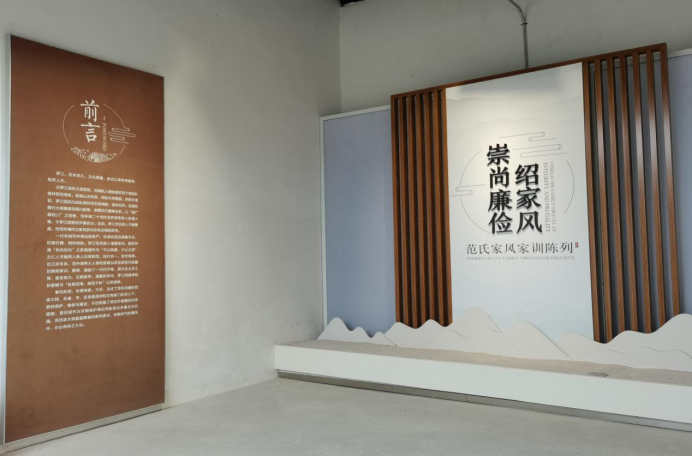 范家大院院落内部设置了五个展陈:追本溯源 寻根问祖——正院场景复原陈列、胸怀天下 先忧后乐——范仲淹生平事迹展、崇尚廉俭绍家风——范氏家风家训陈列、家风永续光世泽——古代家风家训文化陈列、家国天下传春秋——近现代家风家训文化建设陈列。
