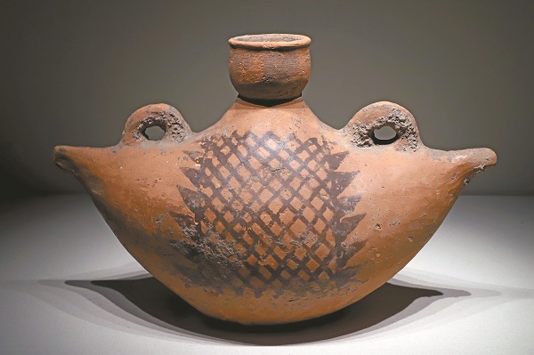 彩陶壶由小口尖底瓶“脱胎换骨”而来,不仅仅是实用功能上的创新,其造型和装饰还有更多的寓意。陶壶宽肩小底,两端如船舷上扬,尤其是壶腹装饰网纹,极似从河里收网捕鱼或者捕鱼结束将网搭在船边晾晒的情景,从造型设计到装饰纹样,都让人联想到渔船、渔网、捕鱼活动等水上生活场面,堪称一件造型别致的艺术品。