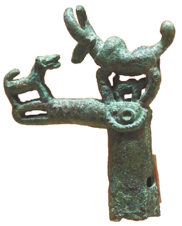 青海湟源县大华中庄墓地曾出土一件鹫(鸠)首牛犬铜权杖饰件(现藏青海省博物馆),高11.3厘米,宽10厘米。鹫(鸠)的颈部呈管状,后有穿孔,用于安装木柄固定,鸠头平伸,环眼,长喙。鹫(鸠)首上站立两牛、一犬。小牛在母牛腹下吃奶,犬张口翘尾,面向大牛狂吠,大牛竖耳扬尾,一副受惊吓状。该器年代为卡约文化(约前900—前600年,西周至春秋时期)时期。