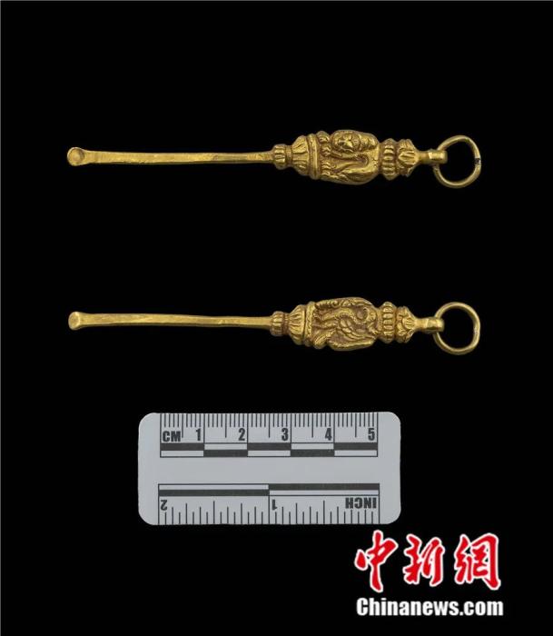 西藏自治区拉萨市当雄县当曲卡镇,当雄墓地出土的雄狮鸟纹金耳勺。图片来自国家文物局