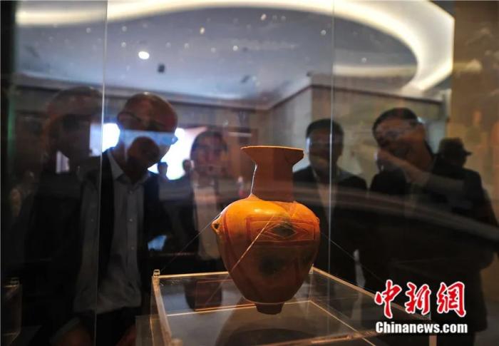 参观者在西藏山南市博物馆观赏彩陶文物。张伟 摄