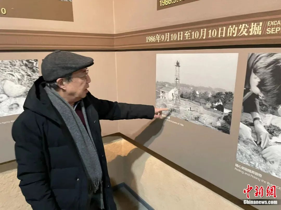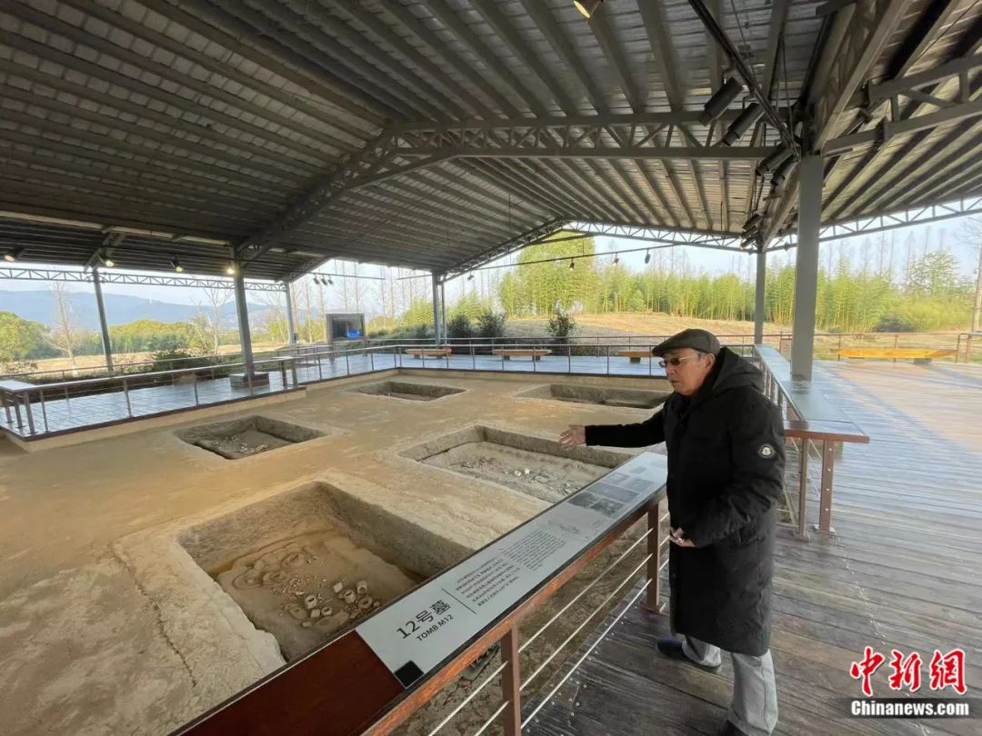 王明达在良渚遗址公园内回忆当年的发掘故事。张煜欢摄