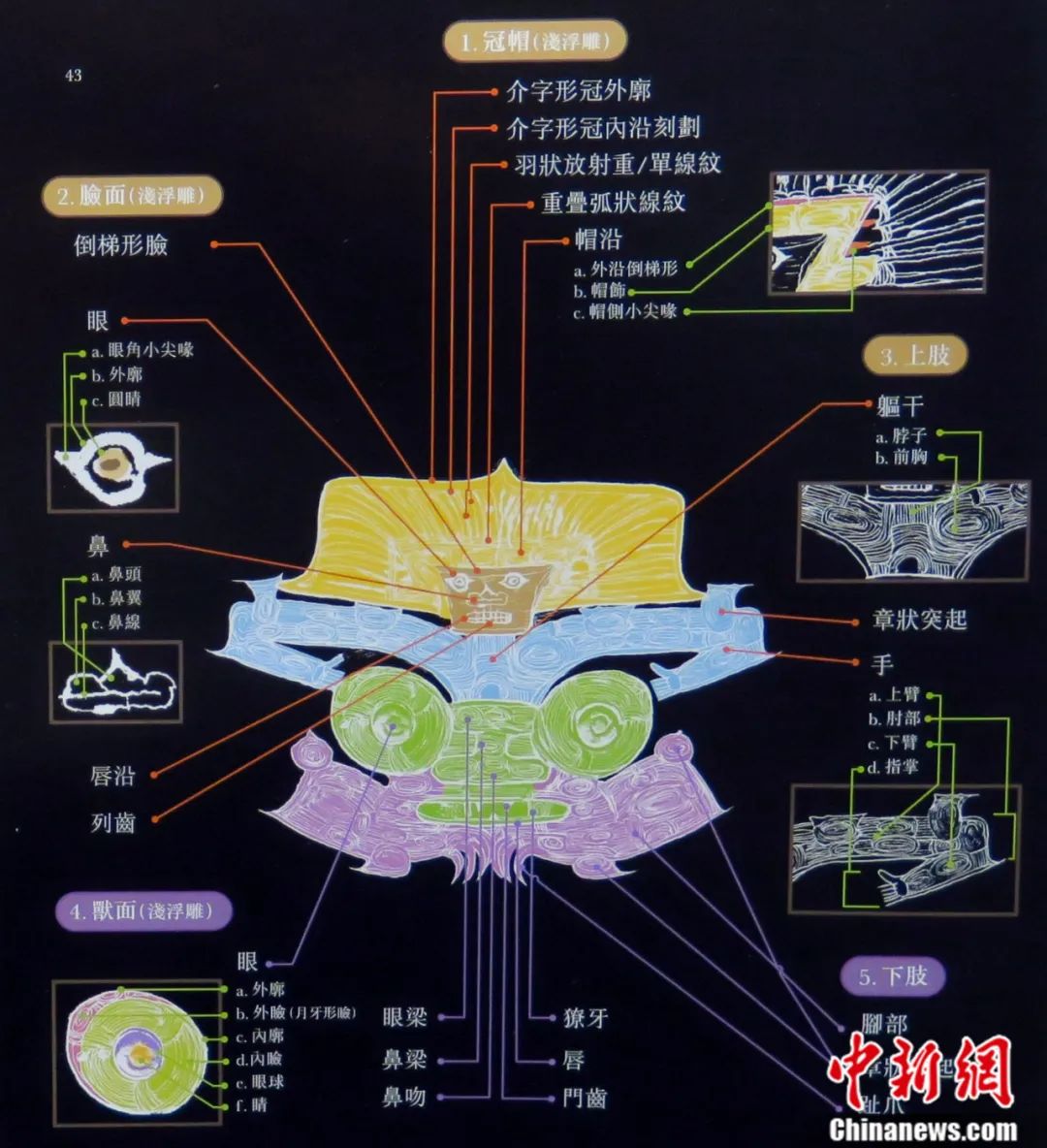 这个图案的主体为“神人”,面部呈倒梯形,眼睛、鼻子、牙齿都非常写实。“神人”头上还戴有高耸的羽冠,内层刻有连续卷云纹的帽饰,外层为放射状羽翎大冠。“神人”的四肢都以阴纹细刻而成,上肢作抬臂、弯肘状,五指平张。“神人”的身下是一只伏在地上的神兽(形似老虎),外框有椭圆形的眼睑,之间以桥形凸面相连,有鼻梁和鼻翼,阔嘴内有尖利的牙齿。