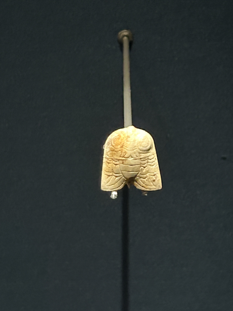 其中M106出土了龙首镯、镂孔兽面纹冠状器、璜串、玉蝉等重要玉器, 此次展厅内就陈列展出了北村遗址M106出土的龙首玉镯、玉蝉等。玉蝉在中国的文化中有着非常特殊的意义。自汉代以来,皆以蝉的羽化比喻人能重生。将玉蝉放于死者口中称作含蝉,寓指精神不死,再生复活。