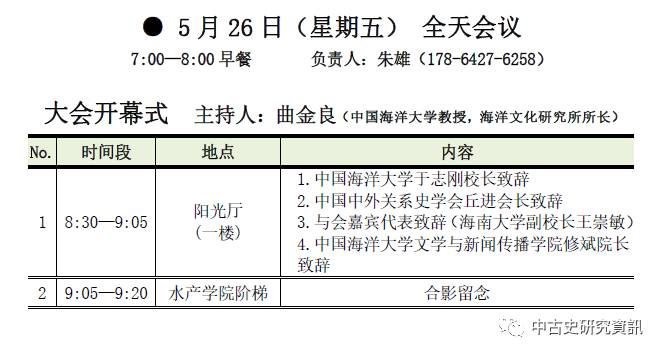 摘要: 2017-05-26中外关系史学会中古史研究信息 “海陆丝绸之路的历史变迁与当代启示” 中国中外关系史学会第九届会员代表大会暨学术研讨会 主办: 中国中外关系史学会、中国海洋大学 承办: 中国海洋大学文学院新闻传播学院 中国海洋大学海洋文化研究所 中国海洋大学文科处 教育部人文社科基地、国家985哲学社科基地 中国海洋大学海洋发展研究院 青岛 2017年5月25—29日 (感谢啸虎兄提供信息! ...