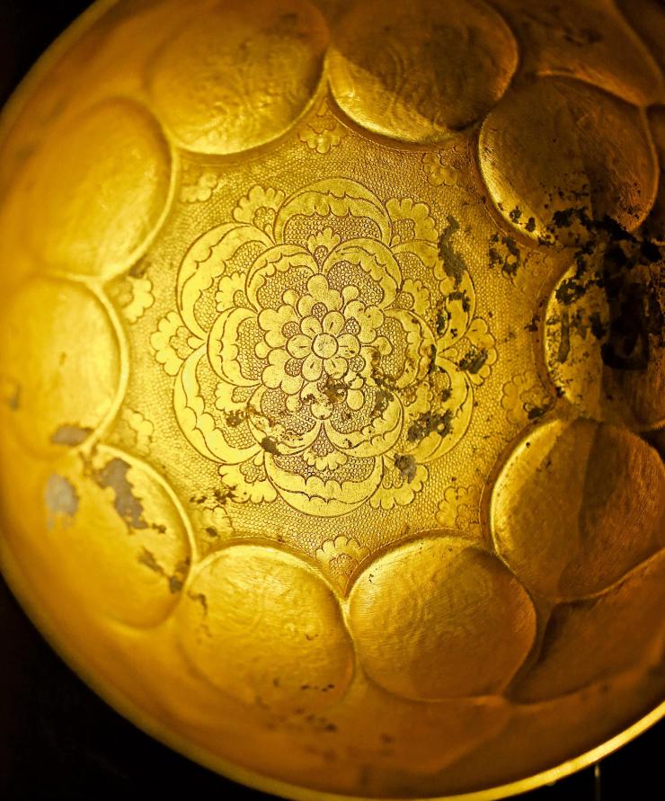 收藏于陕西历史博物馆的唐代鸳鸯莲瓣纹金碗。在莲瓣纹的簇拥下,碗心绽开一朵硕大的宝相花,层层叠叠,繁缛富丽。宝相花吸纳了牡丹瓣纹的元素,成为盛唐国势昌盛、繁花似锦的标志。摄影/动脉影