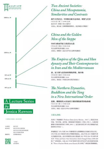 2017年5月22日至6月9日,应北京大学“大学堂”讲学计划的邀请,英国著名艺术史学家、考古学家、牛津大学教授杰西卡•罗森(Jessica Rawson)访问北京大学,进行了四场系列演讲,总题目是公元前3000年至公元前1000年间古代中国与她的邻居们的接触与联系。
