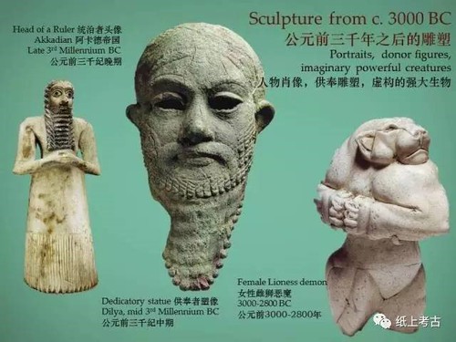 罗森教授演讲前开宗明义,她更关注不同文化发展路径的不同、跨区域的联系及其中国与周边地区的接触。美索不达米亚地区是罗森教授最早从事研究的地区,也是西方认识古代世界、构建社会发展模型所仰赖的重要区域之一,她在演讲中展示了当地公元前十千纪至前三千纪的重要遗迹,如位于土耳其的新石器早期遗址哥贝克力巨石建筑群、新石器至红铜时代的加泰土丘、青铜时代的欧贝德、乌鲁克等遗迹遗物,并突出了雕塑作为“象征(representation)”的载体的重要性,包括新石器至青铜时代的驯化动物、狮子雕塑和公元前三千纪之后的人物肖像。