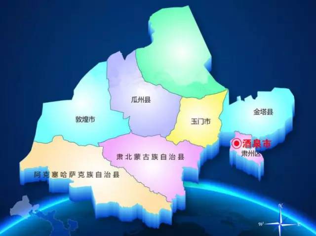 酒泉市位于甘肃省西北部,河西走廊西端的阿尔金山、祁连山与马鬃山(北山)之间。东接张掖市和内蒙古自治区,南接青海省,西接新疆维吾尔自治区,北接蒙古国。酒泉市总面积19.2万平方千米,占甘肃省面积的42%,人口102万,有汉、蒙、回、哈萨克等40多个民族在这里生活。