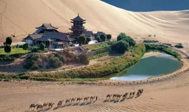 鸣沙山月牙泉风景名胜区地处敦煌城南5千米处,千百年来以山泉共处,沙水共生的沙漠奇观著称于世,被誉为“塞外风光之一绝”。月牙泉地处鸣沙山的环抱之中,因形状酷似一弯新月而得名。月牙泉四周都是高耸的沙山,从而形成了环形山洼,当风进入泉区后会形成上升旋风,把泉四周大量流沙带上山顶,或抛向山峰的另一侧。因而,是特殊的地理环境造就了月牙泉“绵历千古,沙不填之”的神奇。