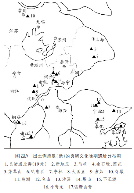 经统计,发现侧扁足(鼎)的遗址共计36处(图四),基本遍布整个环太湖地区。其中,良渚古城及周边地区有19处,分布最为集中,嘉兴地区次之。