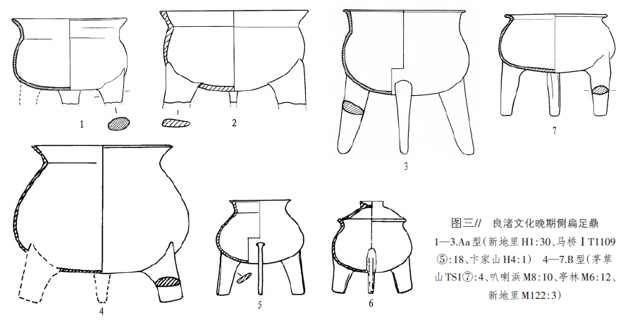 由于很多发现侧扁鼎足的遗址出土遗物不多,不足以判断其准确年代。所以,关于环太湖核心区侧扁足鼎的重现时间,就目前资料看,大致相当于新地里第四段(即新地里H7和叭喇浜M8的年代)。另外,需要指出的是,从良渚文化晚期早段到晚期晚段,侧扁足鼎从重现到逐渐流行,是一个量变的过程,该阶段遗存的性质并未改变,仍为良渚文化。