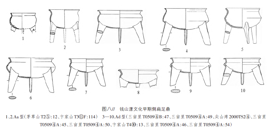 塘山背遗址却仍然非常流行,并且还是常见的随葬炊器之一。从时间节点看,钱塘江流域侧扁足鼎出现之际正是前文谈到的环太湖核心地区侧扁足鼎消失之时,时间上有惊人的巧合。